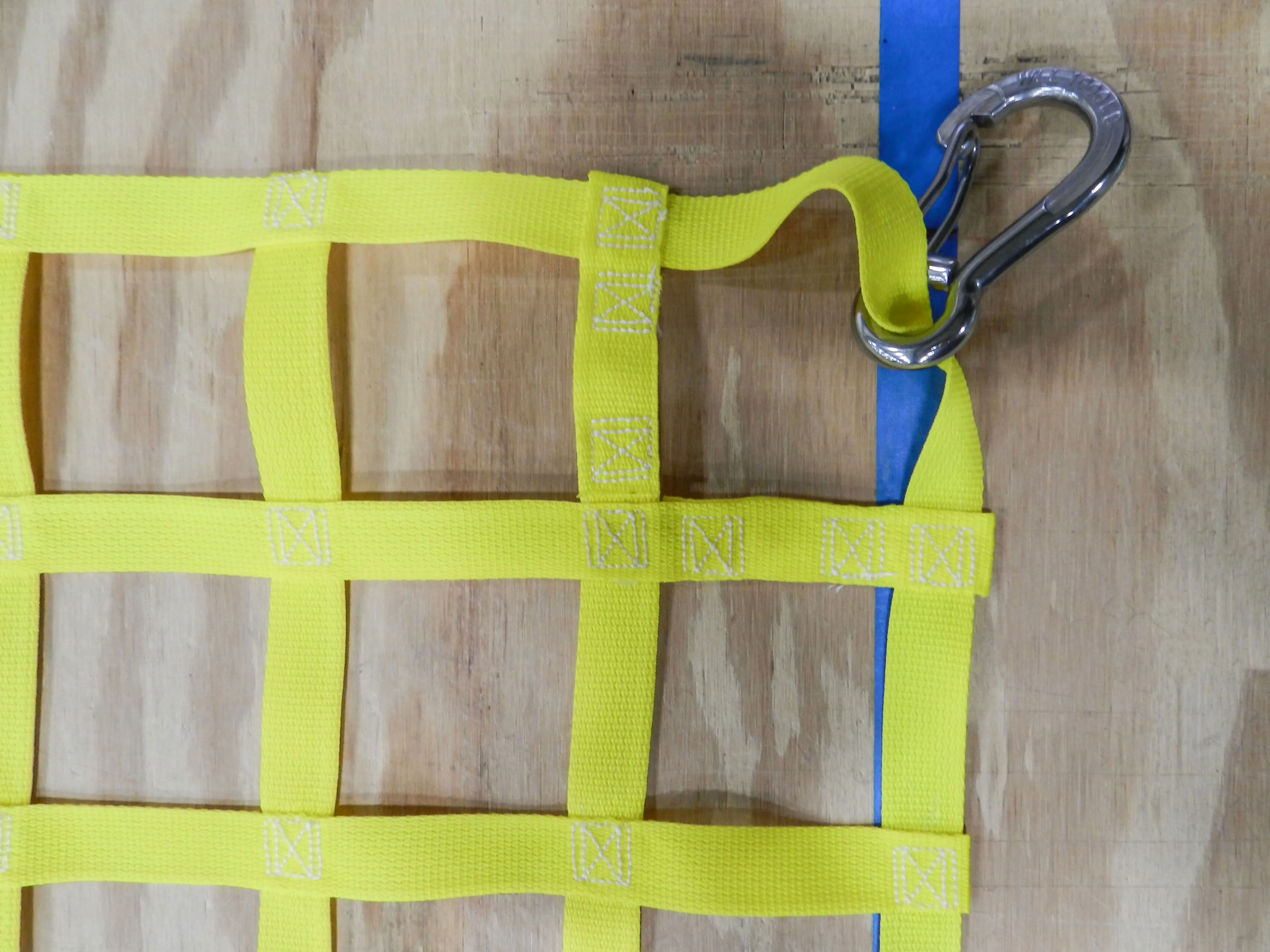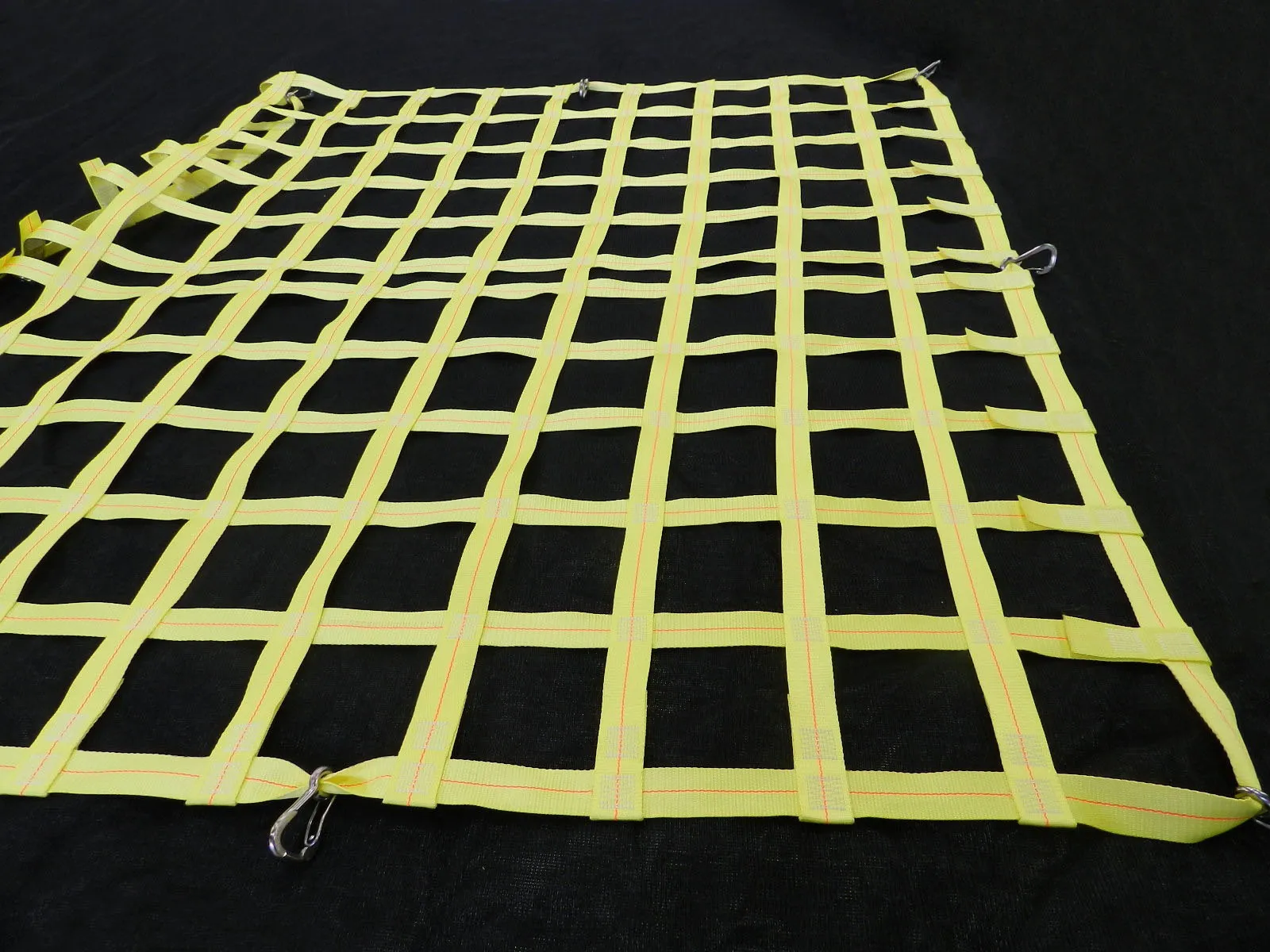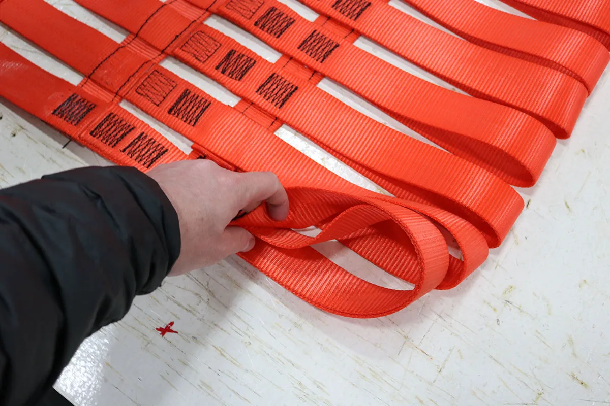 Cross section of the snap-hook sewn directly into the extension extruding from the cargo net. Custom lengths available.